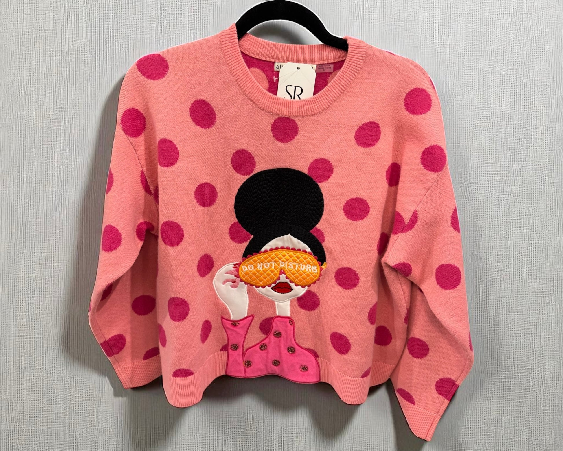 This Gleeson Do Not Disturb Appliqué Crewneck Sweater is a classic knitwear piece featuring fuchsia polka dot motif, front Stace patch with rhinestones, crew neck, dropped shoulders and ribbed edges. Crafted with the wool-blend fabric, this sweater can be paired effortlessly with various outfits, while the "Do Not Disturb" embroidery detail adds a touch of character and individuality to any denim!