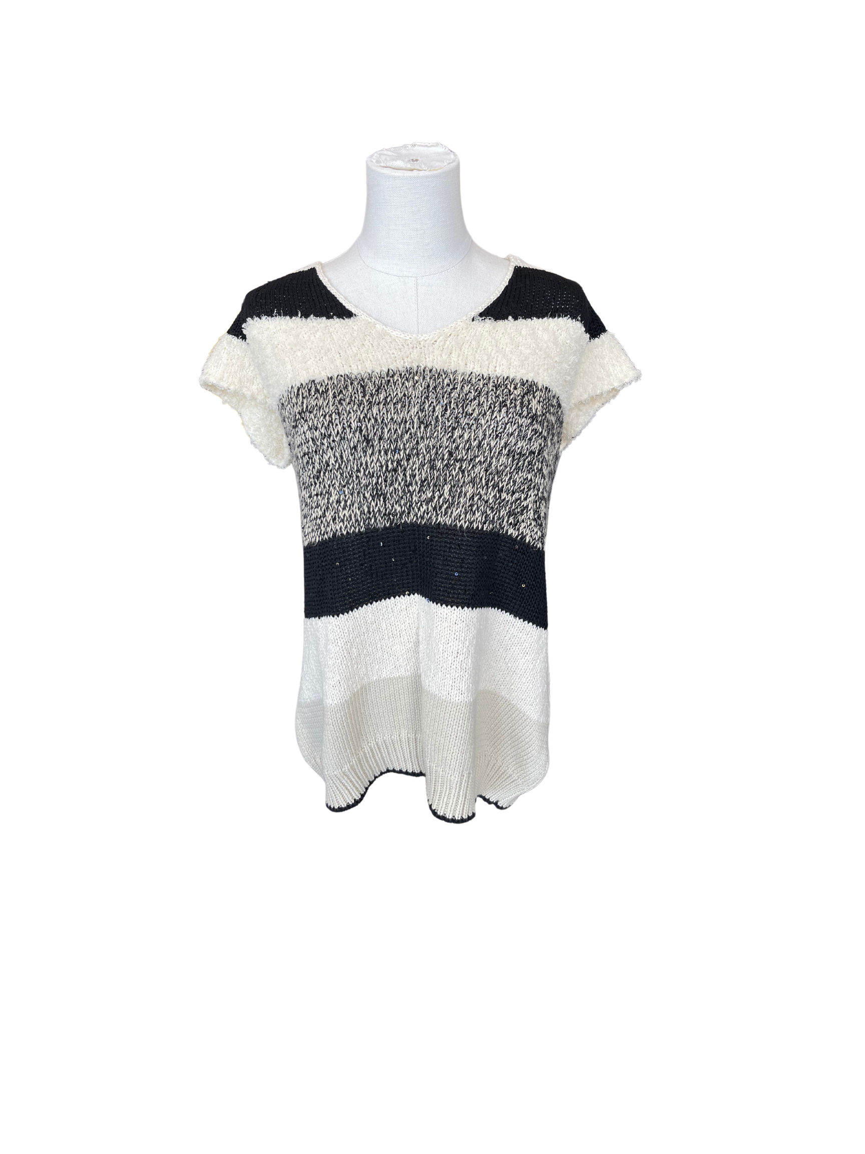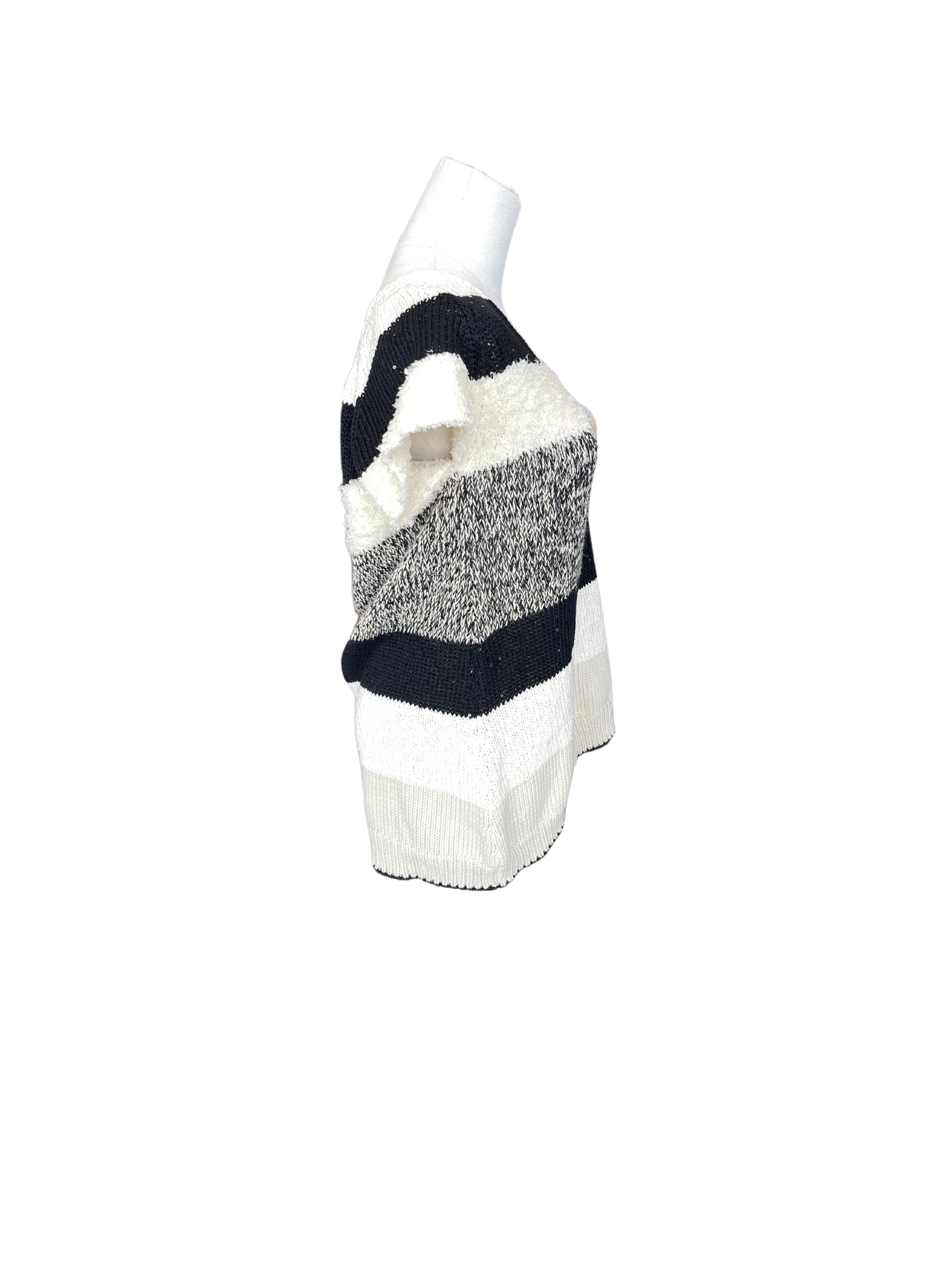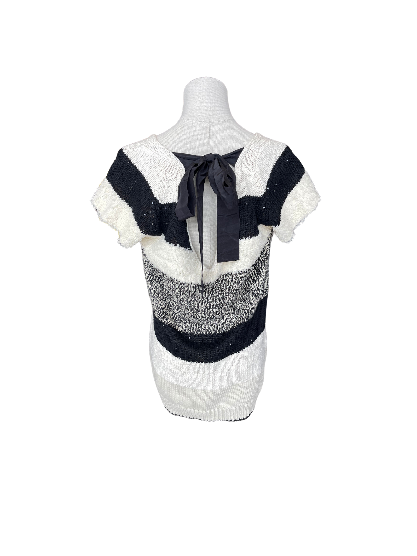 Brunello Cucinelli cap-sleeve sweater in off white, sand, and black mixed textures with different blends of cotton, nylon, linen, hemp, and silk, With V neck, V back, and sequins. Closes with bow straps on the back in black silk (100%). Unlined. Has been worn and is in excellent condition.