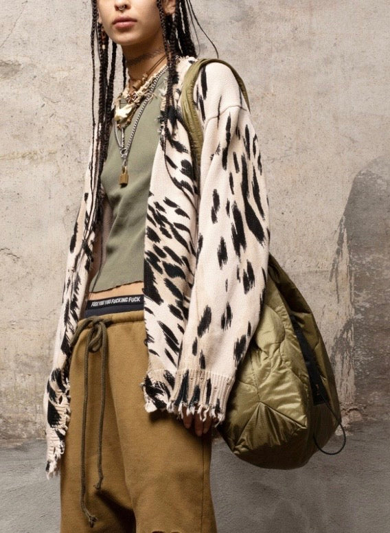 A beige cardigan can become the focal point of any outfit. The contrasting black cheetah pattern and random distressing accentuate the design, creating the illusion of a piece with a history. Featuring a V-neck and dropped shoulders, with buttons at front.