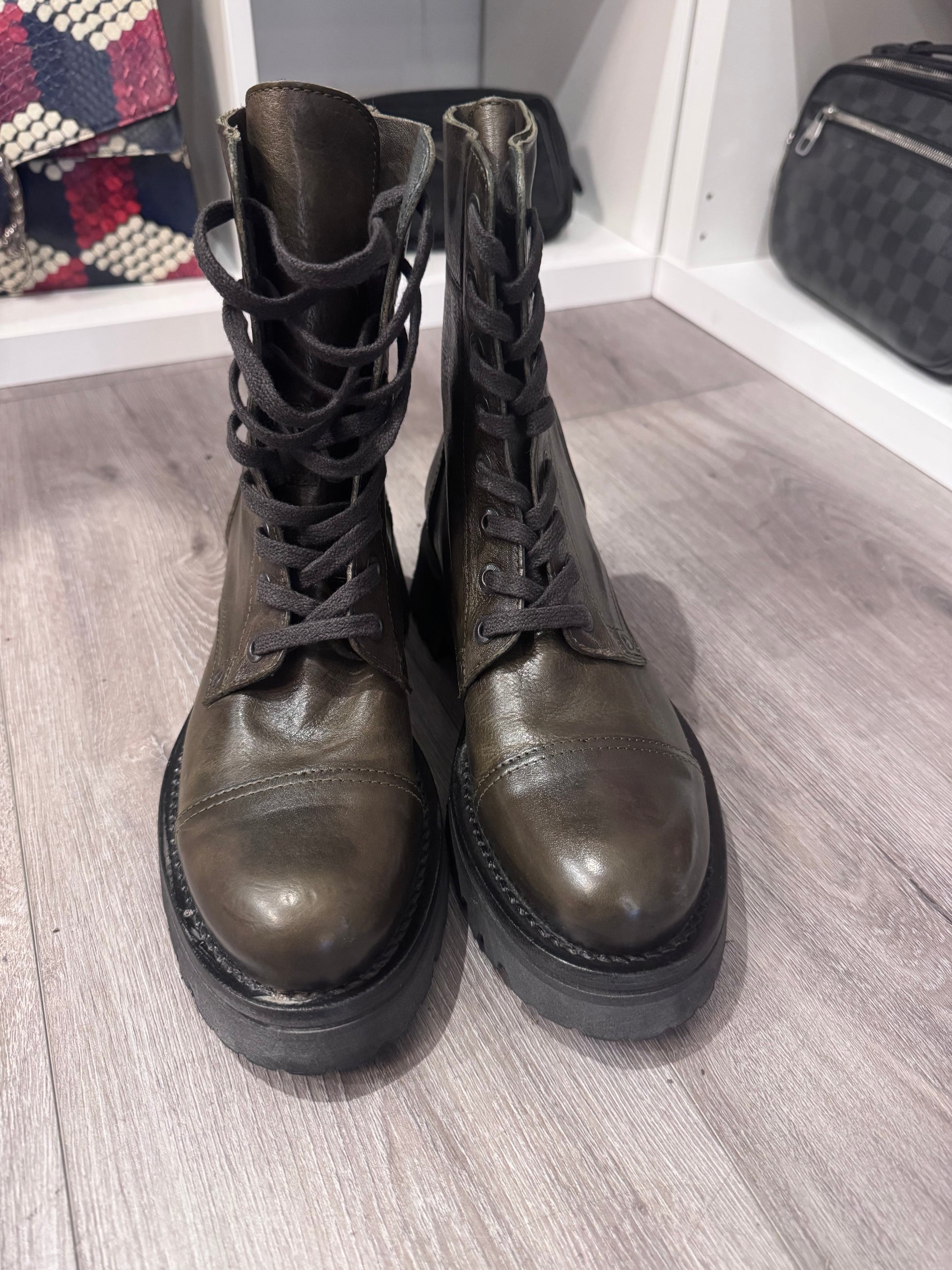 A modern take on a classic combat boot. A tall lace-up silhouette, sitting on a chunky treaded lugged sole. Colour is brown