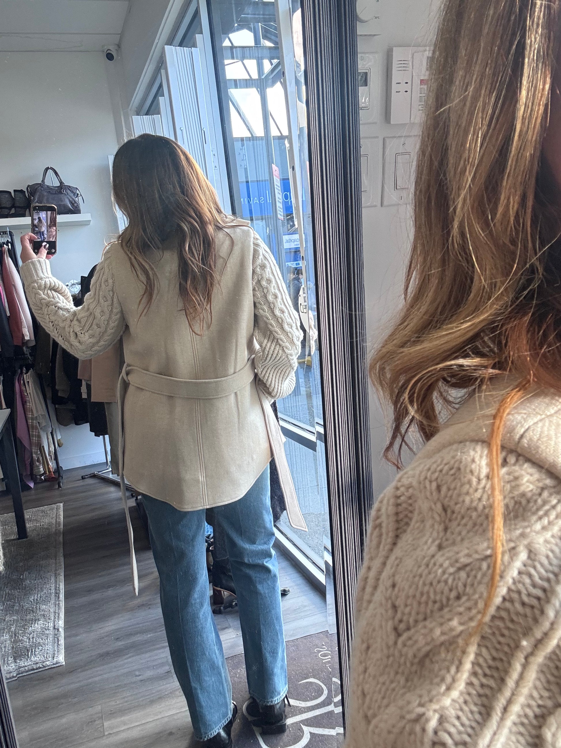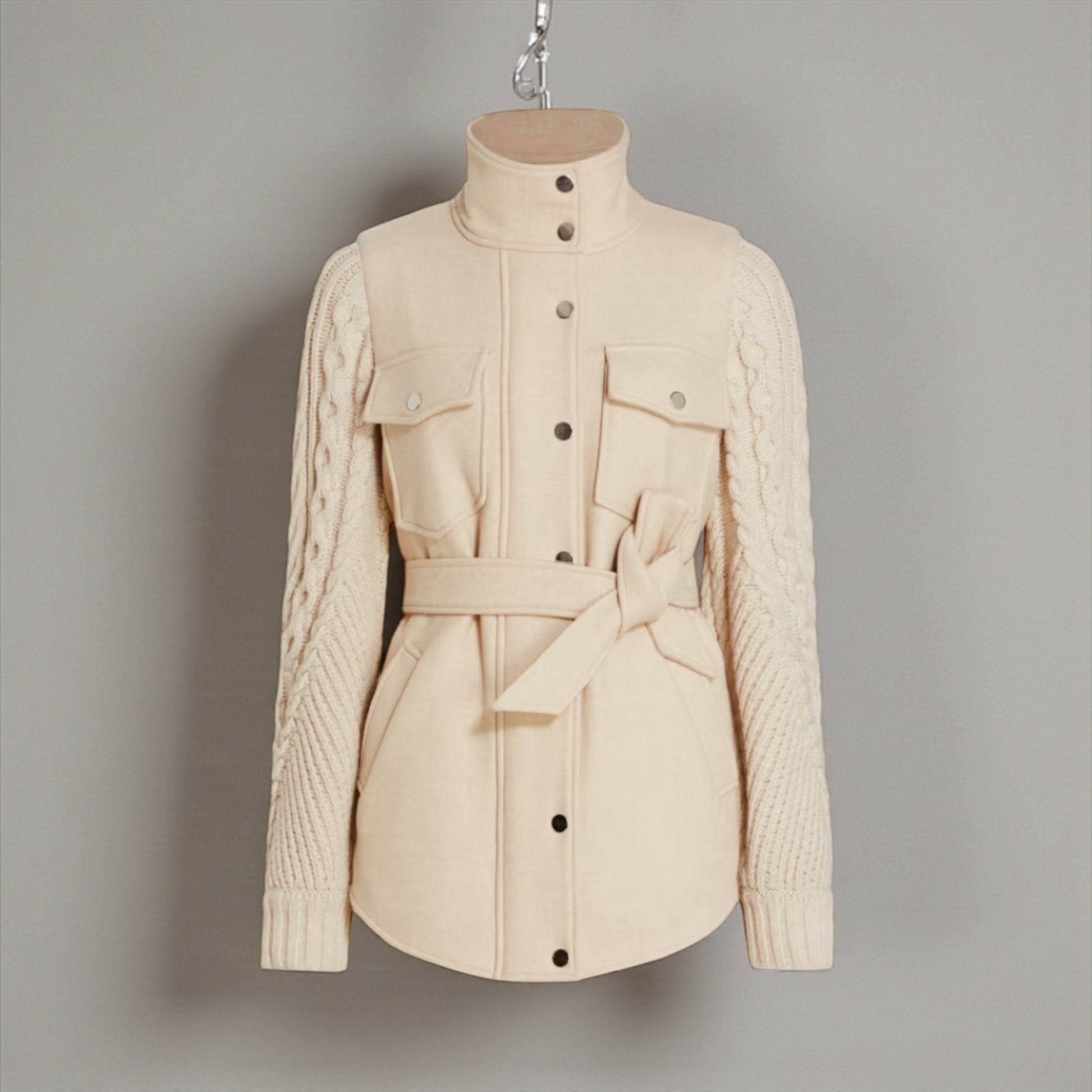 This coat has a thick cable knit sleeve. The sweater appearance of the sleeve has a relaxed fit. The bodice of the coat is a thick material with a zipper and snap button closure. The waist is emphasized by a self tie belt. Self: 70% Wool 30% Polyamide Principal: 70% Laine 30% Polyamide